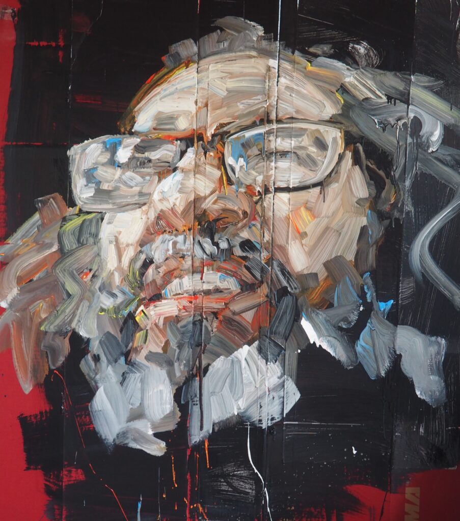 This work makes compelling use of the traditional, though not conventional portrait elements using a limited palette, perspective and movement. The paint reveals the artist’s physical presence in every mark, texture and rhythm. Importantly, the use of perspective also serves to highlight the artist’s own action of thinking and movement so that we witness the act of creation itself in this work. An outstanding achievement depicting the deep connection between the artist, his materials, and his life.