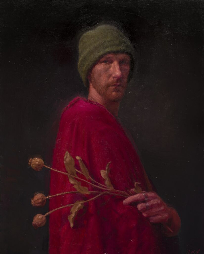 The use of atmosphere in this painting is great. Brush marks are varied, and the composition is engaging. Interestingly, sharp edges are not used in the face, but reserved for the poppy leaves, leaving the face more ambiguous. A fascinating use of subtle layering of paint gives a sense of optical depth.