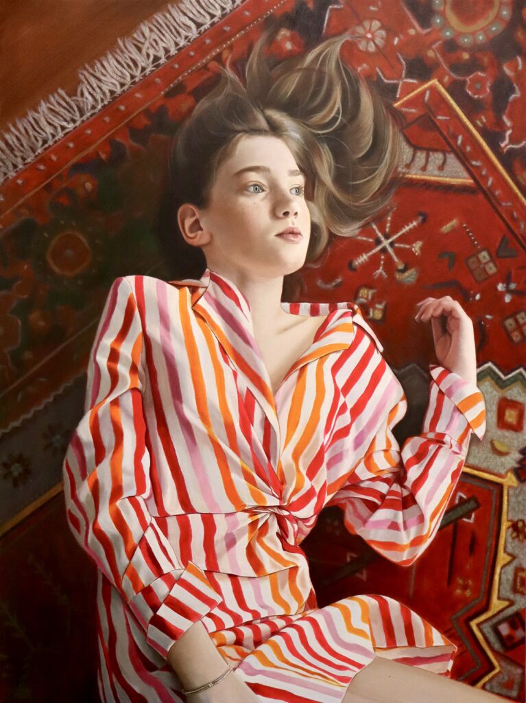 As a judge, I was immediately drawn to ‘Girl on Rug’ for its thoughtful composition and refined sense of balance. The aerial viewpoint creates a flattened perspective that highlights the dialogue between the striped dress and the ornate rug beneath. I appreciate the artist’s confident use of cropping — the rug’s fringe at the top left and the extended leg anchoring the lower edge — which adds both tension and harmony to the work. The longer you look, the more you notice how the careful design and quiet emotion work hand in hand.